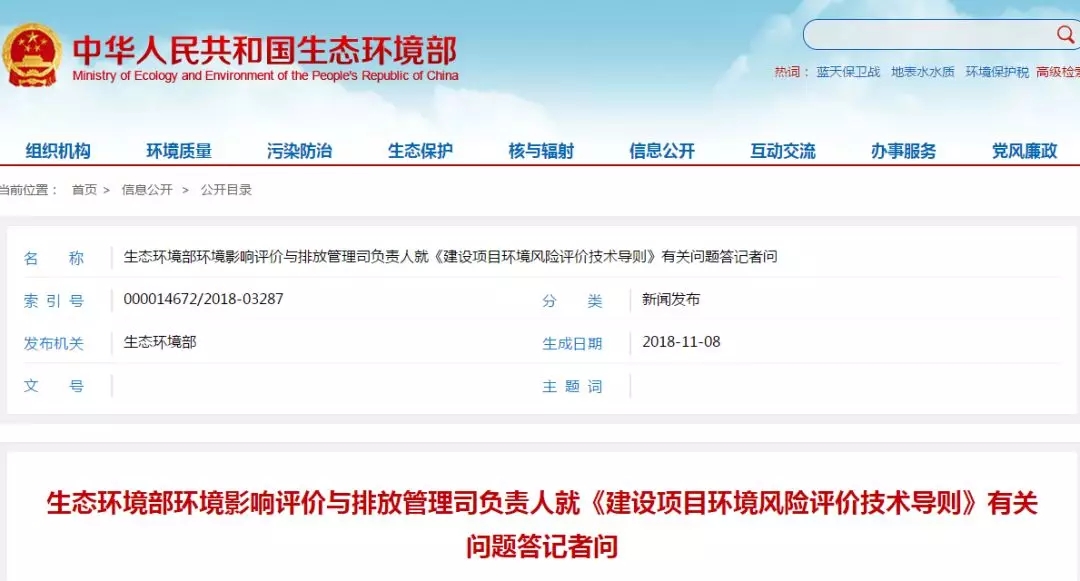 生態(tài)環(huán)境部日前印發(fā)了《建設(shè)項目環(huán)境風(fēng)險評價技術(shù)導(dǎo)則》(HJ169-2018)(以下簡稱《風(fēng)險導(dǎo)則》),生態(tài)環(huán)境部環(huán)境影響評價與排放管理司負(fù)責(zé)人就《風(fēng)險導(dǎo)則》修訂的背景、思路及內(nèi)容等有關(guān)問題回答了記者的提問。